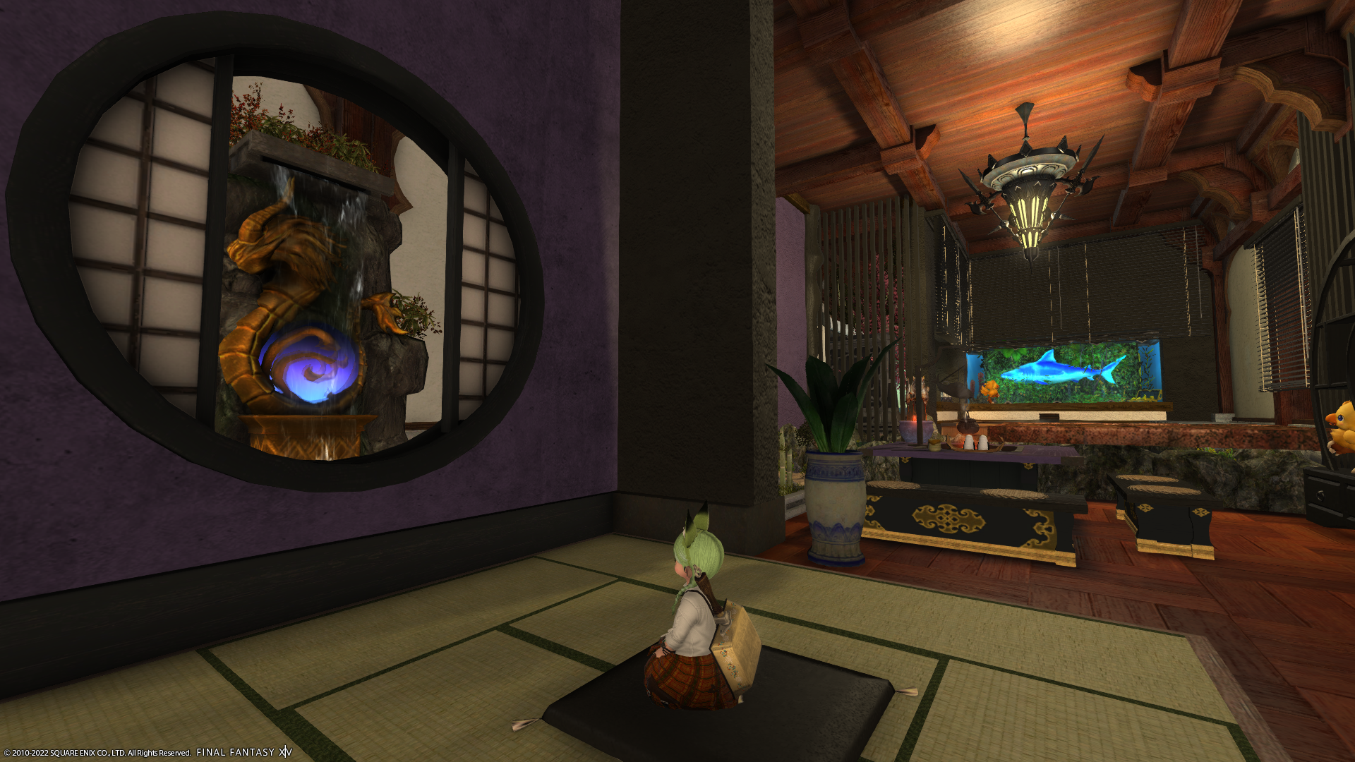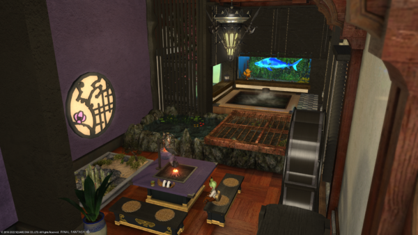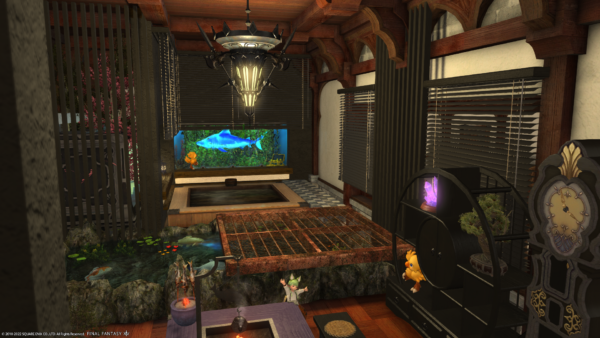 そして進入禁止用に設置していた水槽になぜかサメが…。なにかの背景アイテムを置こうと思っていたのですが、他のFCメンバーさんのいたずらにより水槽にはサメが入れられ、ところどころアルファのぬいぐるみが設置されております。