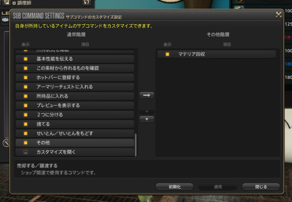 サブコマンドとして出てくるメニューって設定できるのですね、順番とか階層とか。とりあえずマテリア回収だけはその他にいれて階層を下げサクッと選択できないようにしておきました。他のメニューもカスタムしたらもう少し快適になりそうです。