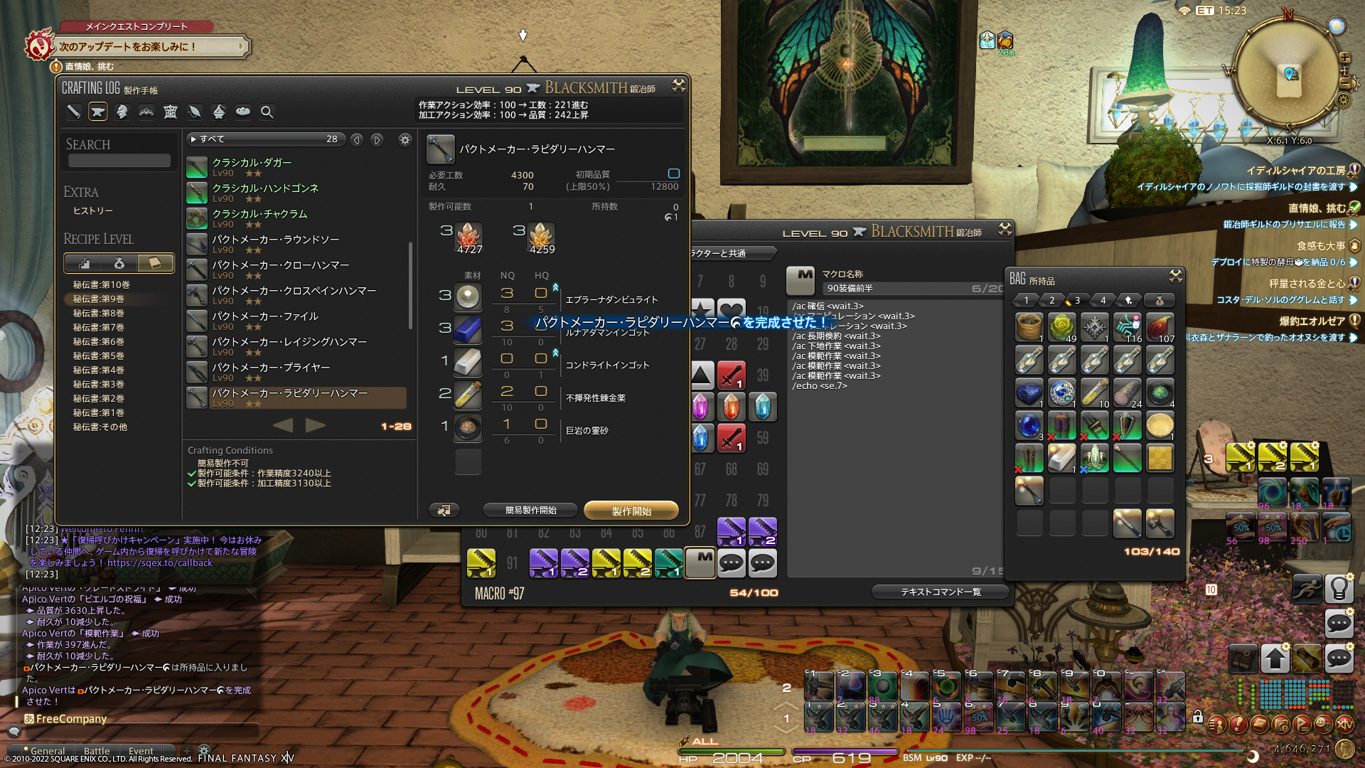 ちまちま素材を集めてはちょこちょこクラフトしております。NQ素材で作成するとできた道具もNQだったりするので、そのときは泣く泣く分解しております。そのおかげで、素材が足りなくなっちゃったよー。