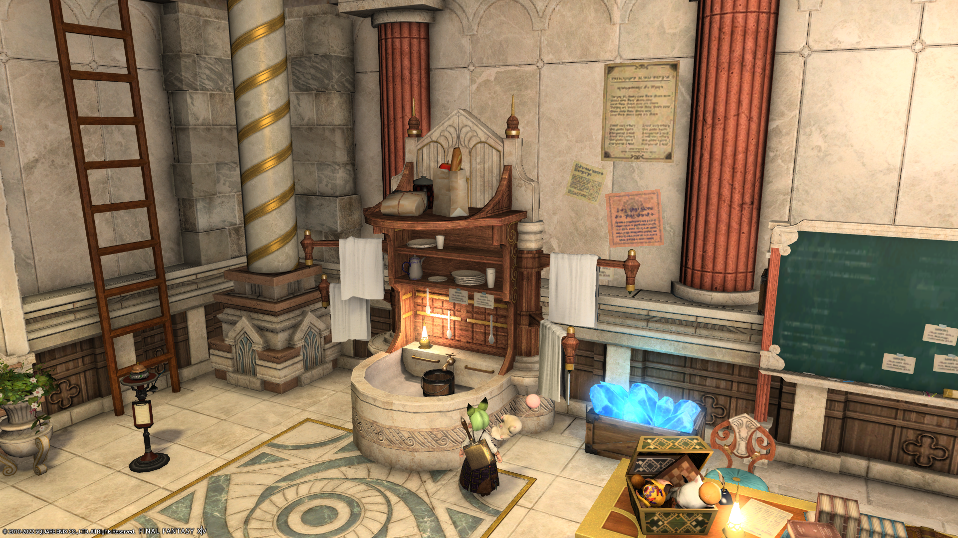 なるほど、こんなところにすでに設置されてたのですね。それにしても、一番うえの棚にフランスパンみたいなの置かれているけど、あんな高いところに仕舞ったらエルヴァーンさんでも届かないのでは…。