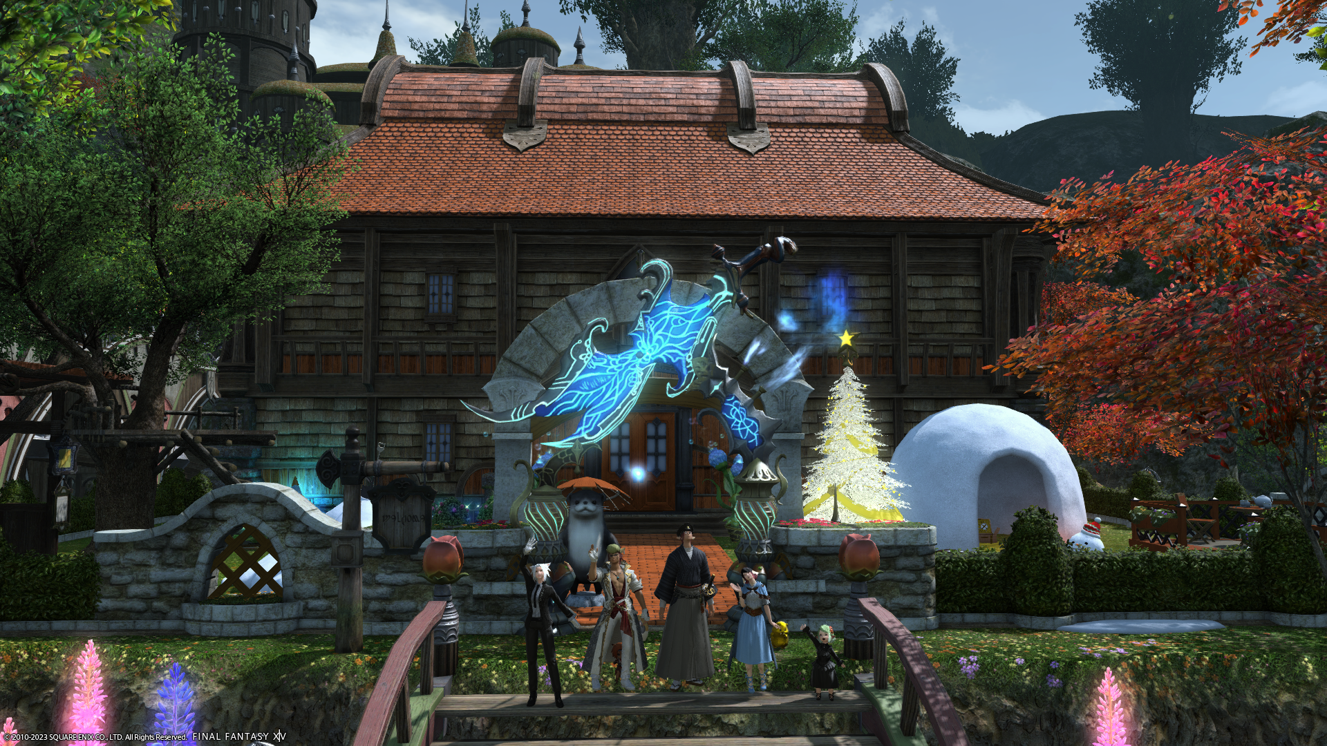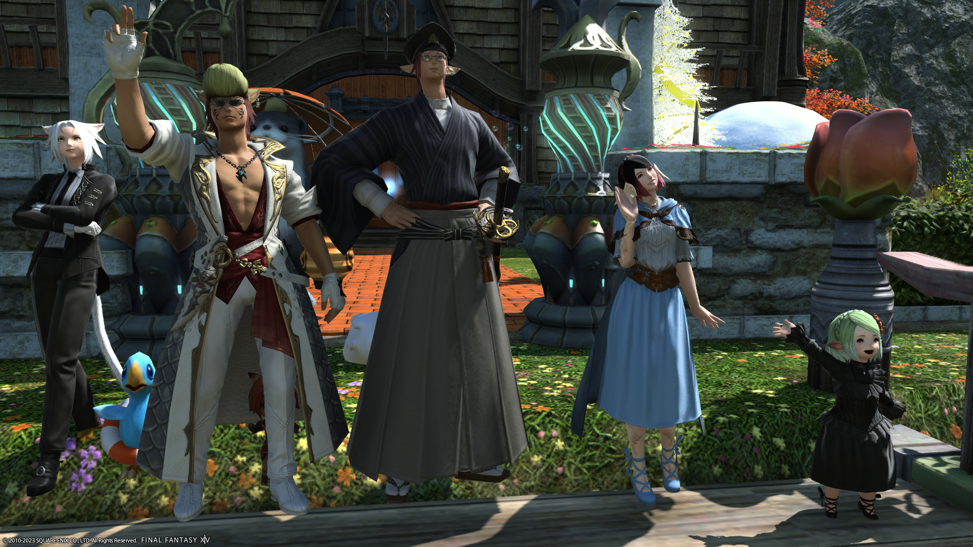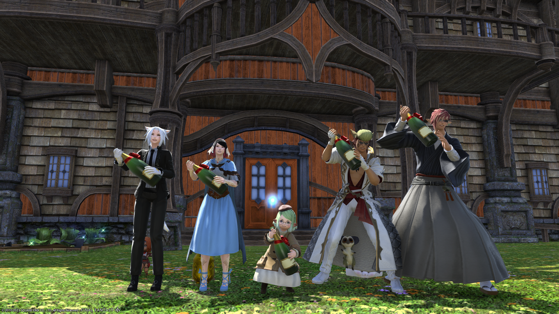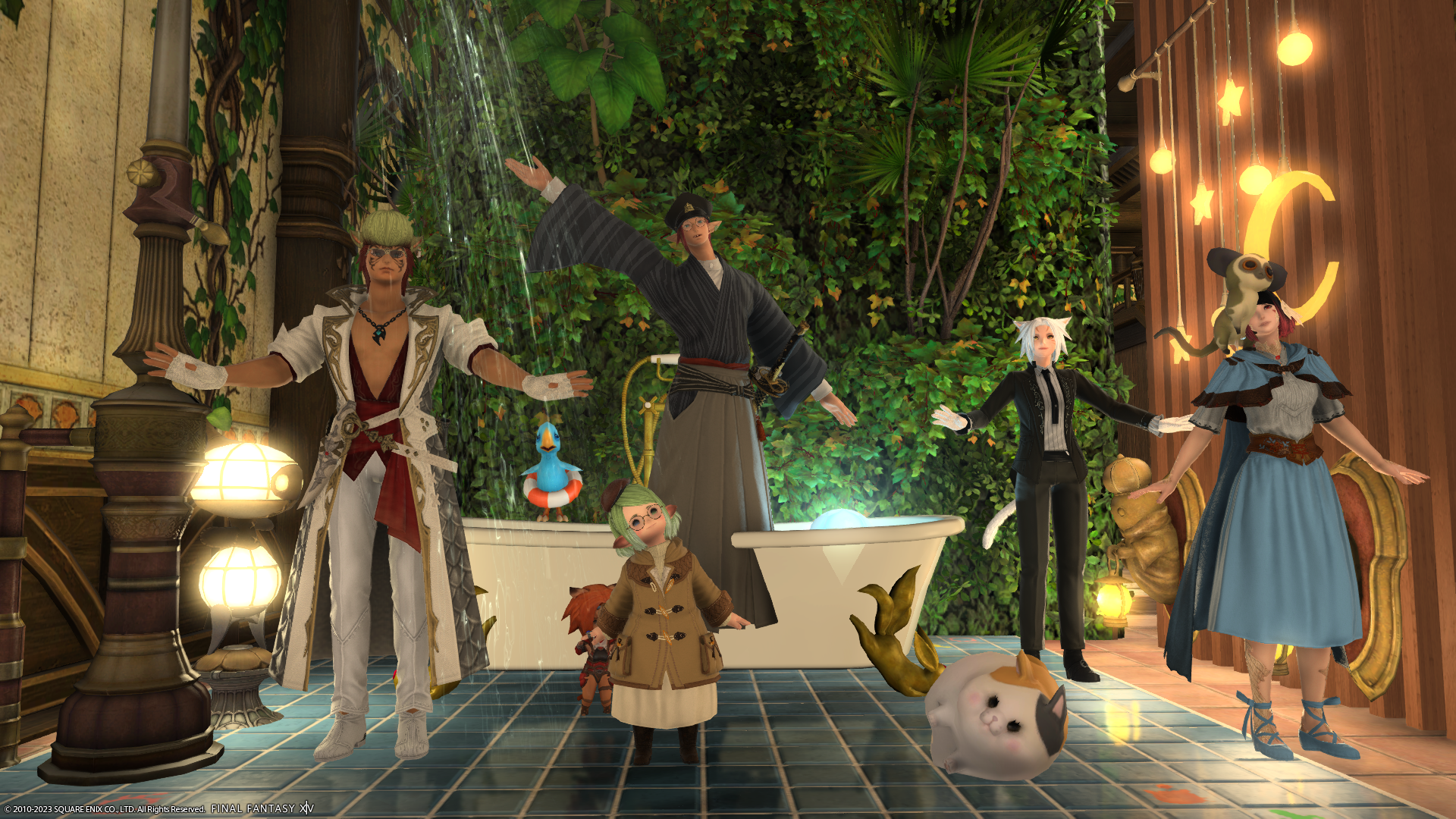 あたらしいお家に引っ越してはしゃぐララフェルたち。右はメンバーさんの倉庫ちゃん。