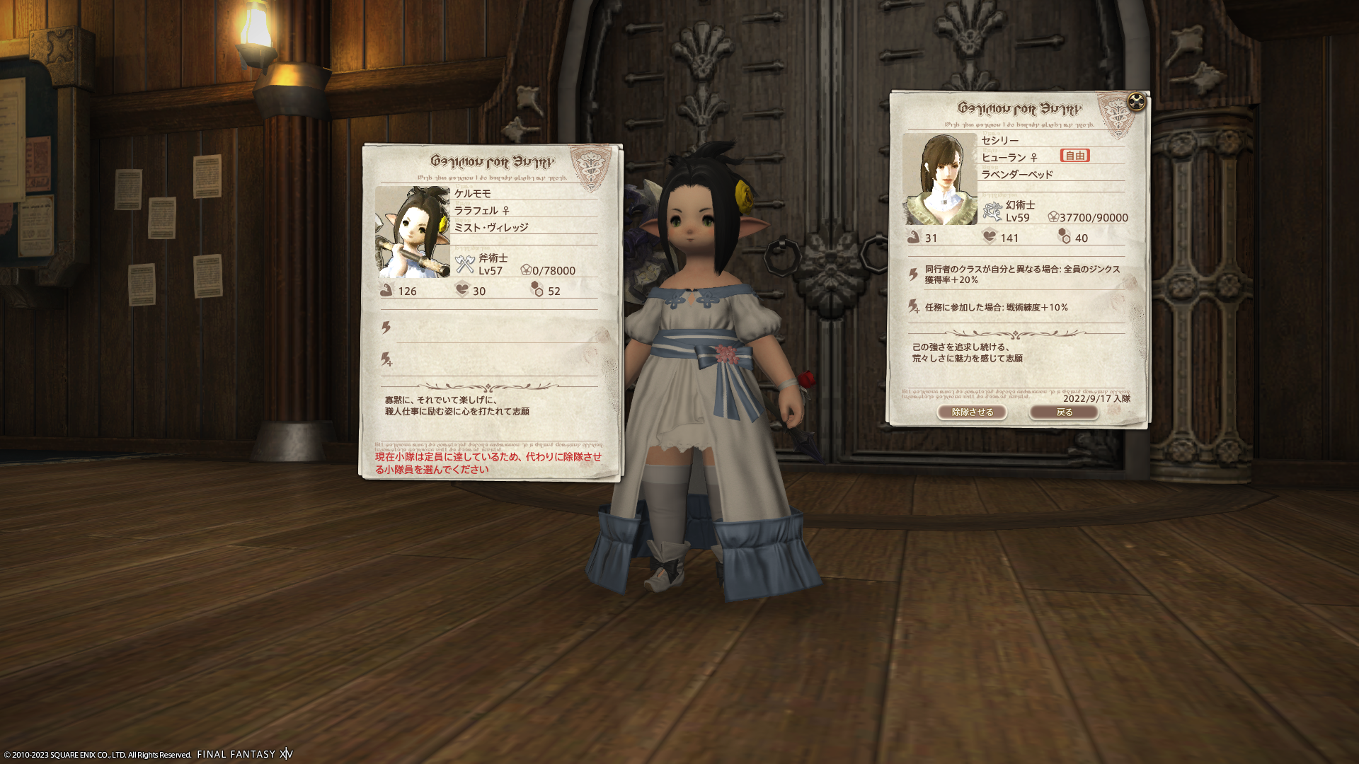 これで引率役のムーリエルさん(エレゼン)以外はすべてララフェルになりました。わーい。でもセシリーさんは小隊の中では珍しく顔立ち整ってるキャラクターさんだよね…名残惜しいけどこれもララフェルPTのため…。
