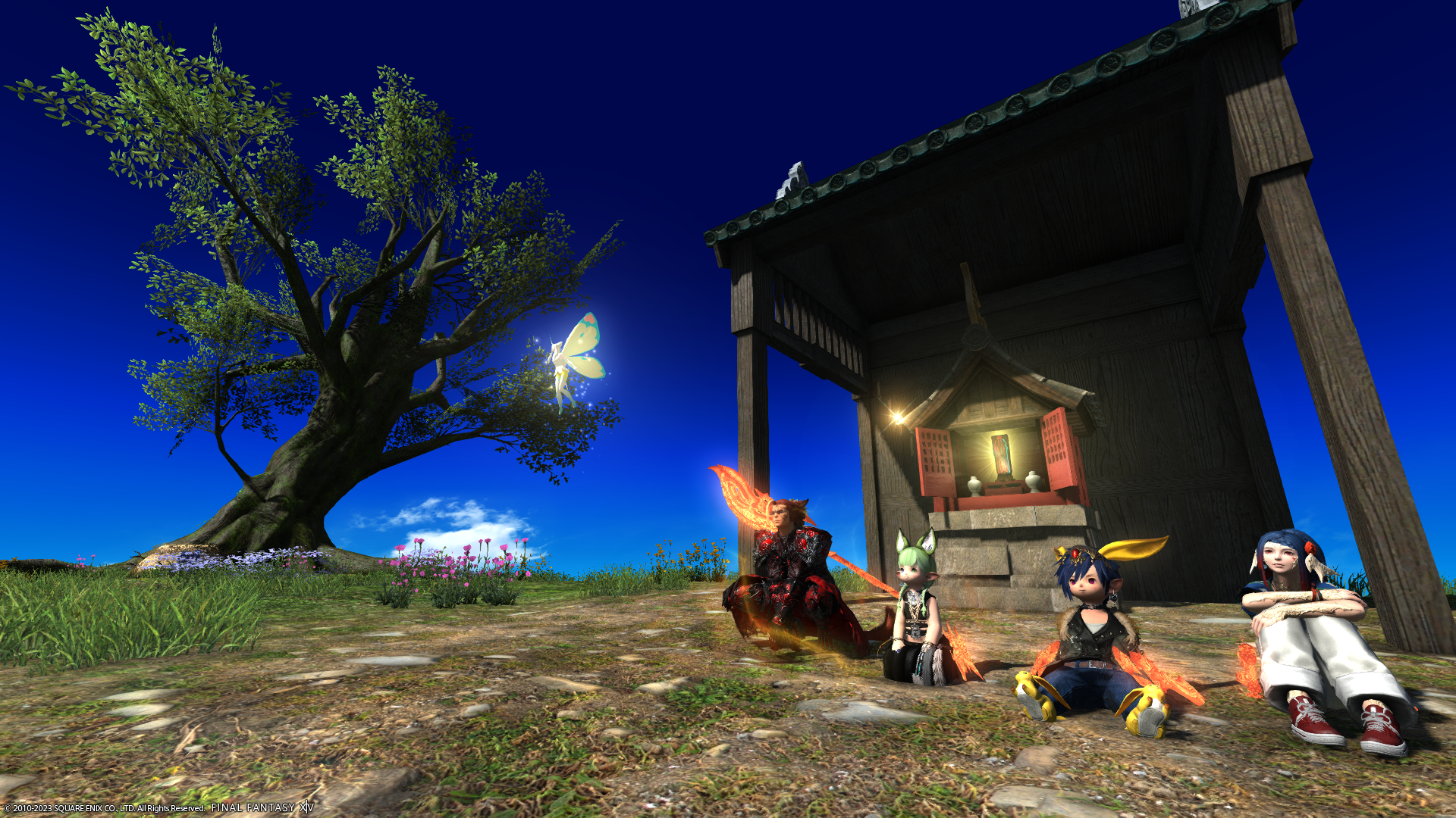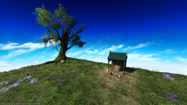 広い草原に木と祠がありました。