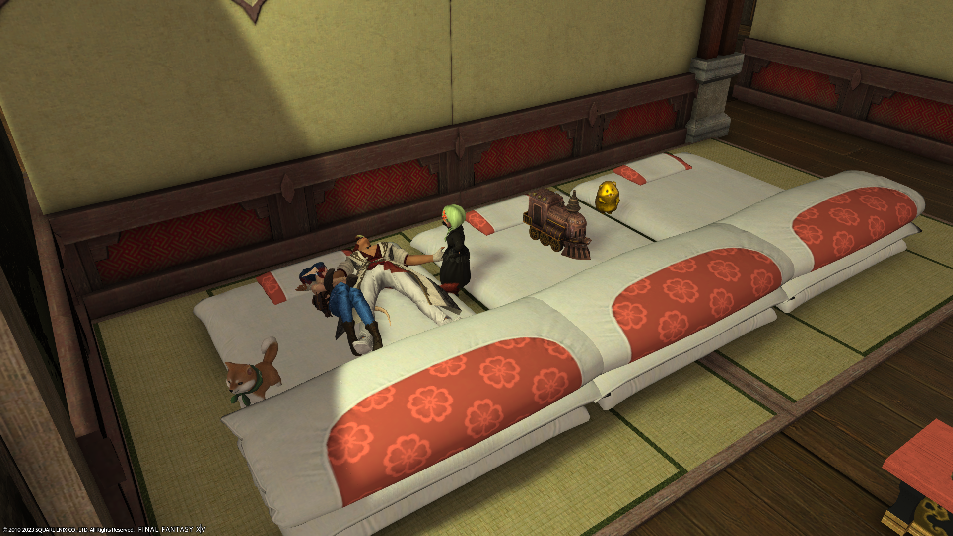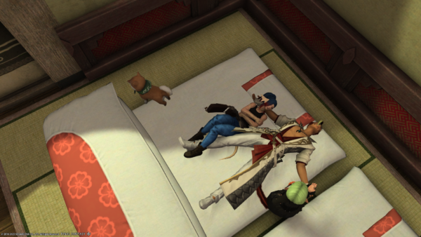 アウラさんがおふとんで寝ていると隣でなにやらミコッテさんがゴソゴソしはじめ、アウラさんの危機を感じたので「きゃーアウラさん逃げてー!」と言ったのですが…