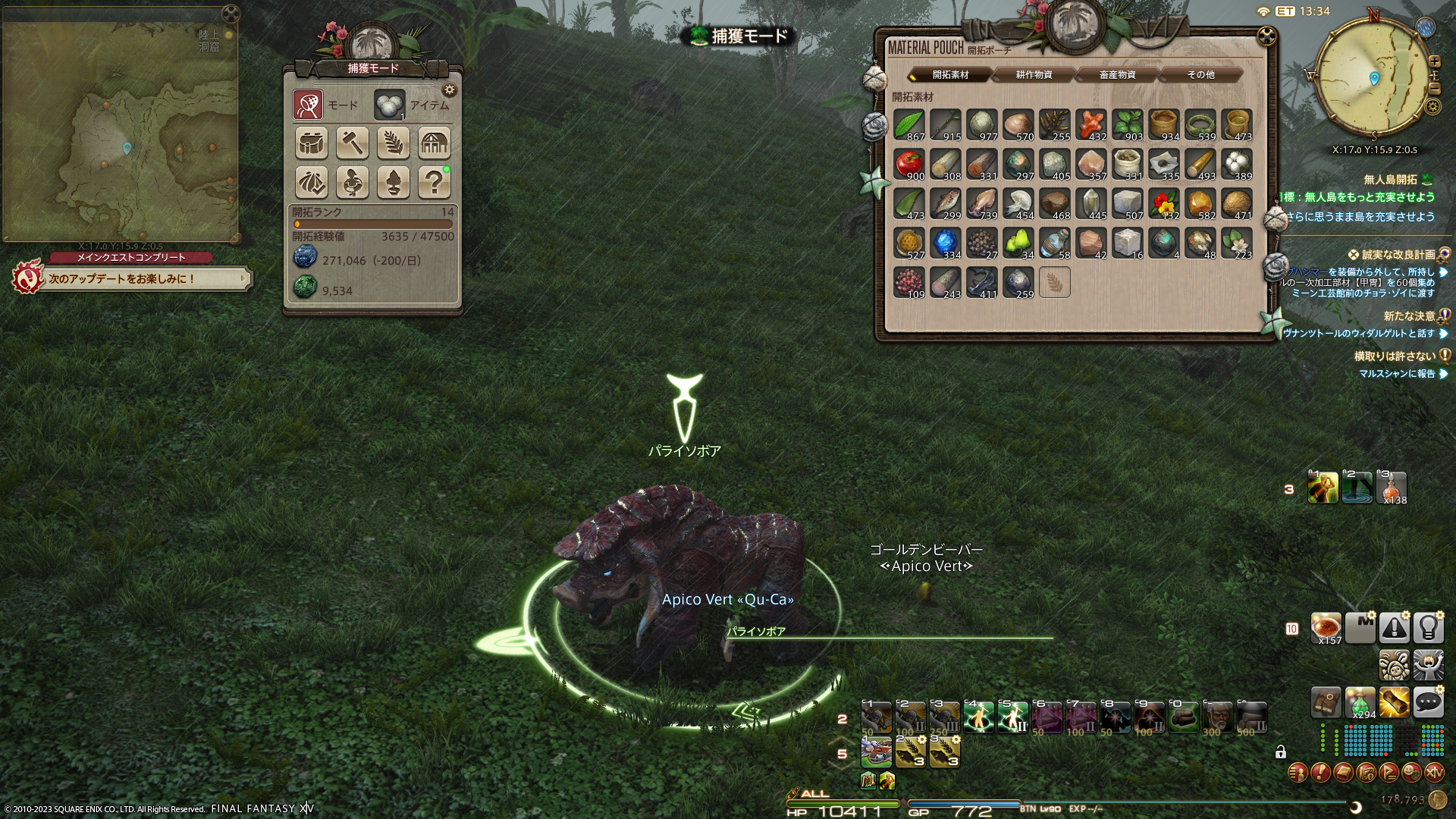 フリーカンパニーメンバーさんは、早々に新装備を自作なさってマテリアもフル禁断してらっしゃったので、わたくしもさっさと装備を自作したいところです。モーエンツール作成、がんばろう…。