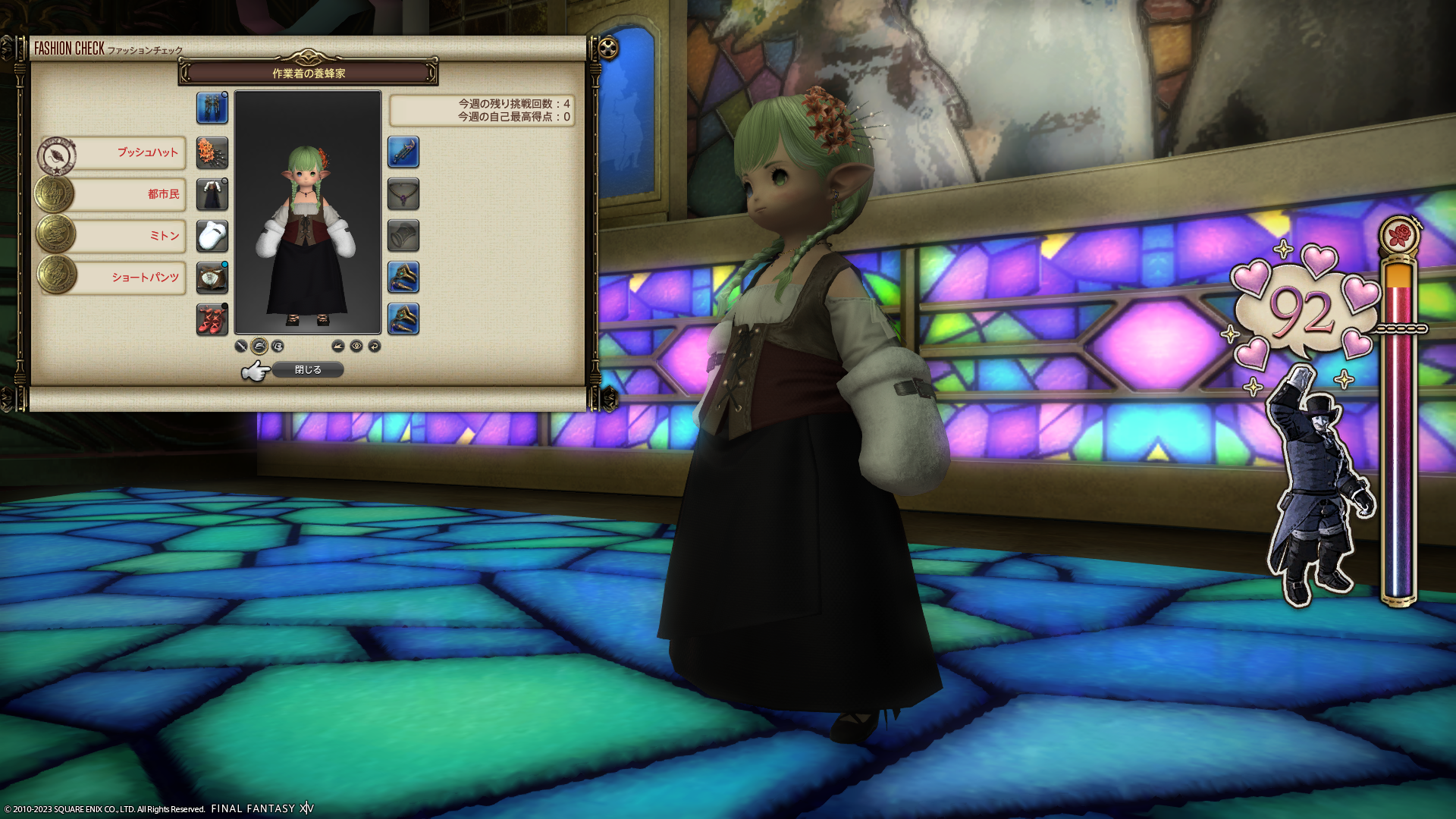 リビエラドレス、前から交換するか悩んでいたので、今回のファッションチェックを機に交換しました。ゴールドソーサーのMGPと交換できる装備です、かわいいよね。