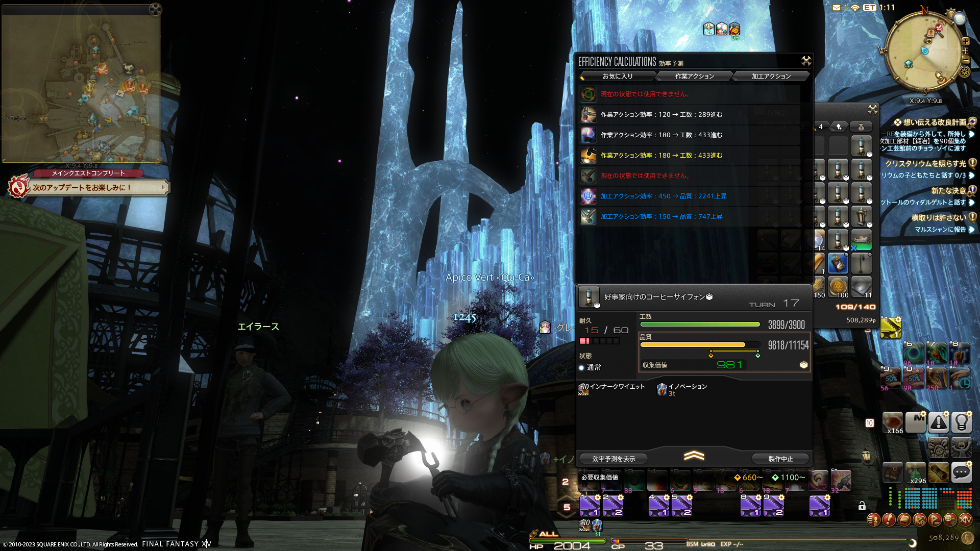 2回目は、加工素材を作る手間はかかるけれど、HQ素材を使えるので、最初に収集価値が少し上がった状態からスタートできます。なので、収集価値が最大のアイテムのみクラフトすることができました。2回目のほうが個人的には楽だなーと思いました。